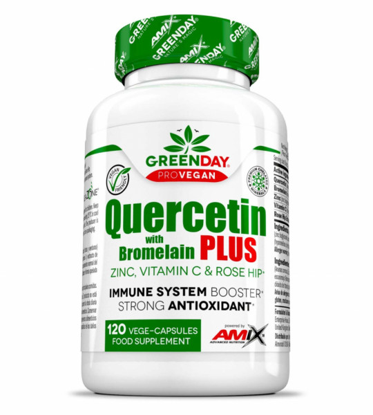 Amix GreenDay Quercetin with Bromelain – харчова добавка в рослинних капсулах. Містить високоефективний кверцетин в поєднанні з бромелайном. Збагачений вітаміном С, цинком та екстрактом шипшини.