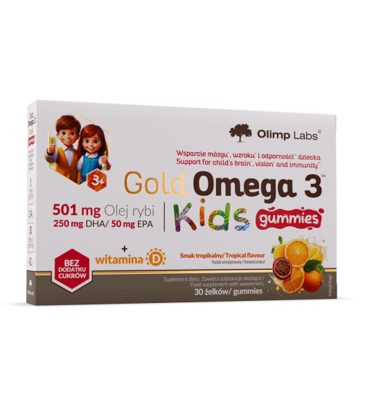 Olimp Gold Omega 3 Kids Gummies – високоякісна харчова добавки в смачних жувальних цукерках. Базується на риб’ячому жирі та рослинних оліях. Забезпечує організм цінними омега-3 жирними кислотами. Доповнений вітаміном D3. Розроблений із врахуванням потреб організму дітей старше 3 років.