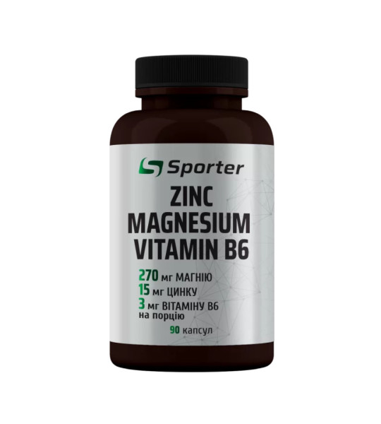 Sporter Zinc Magnesium + Vitamin B6 – харчова добавка в желатинових капсулах. Містить добрезасвоювані формі магнію та цинку, які діють синергетично. Доповнена вітаміном В6. Ідеальний варіант для спортсменів та фізично активних людей.