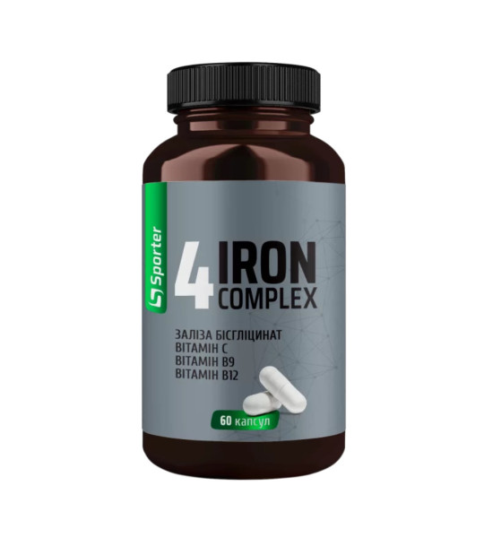 Sporter 4 Iron Complex – харчова добавка в желатинових капсулах. Містить високоефективне хелатне залізо в поєднанні з вітамінами В9 та В12. Підсилений також вітаміном С для покращення поглинання заліза. Не викликає побічних ефектів та дискомфортних відчуттів в ШКТ.