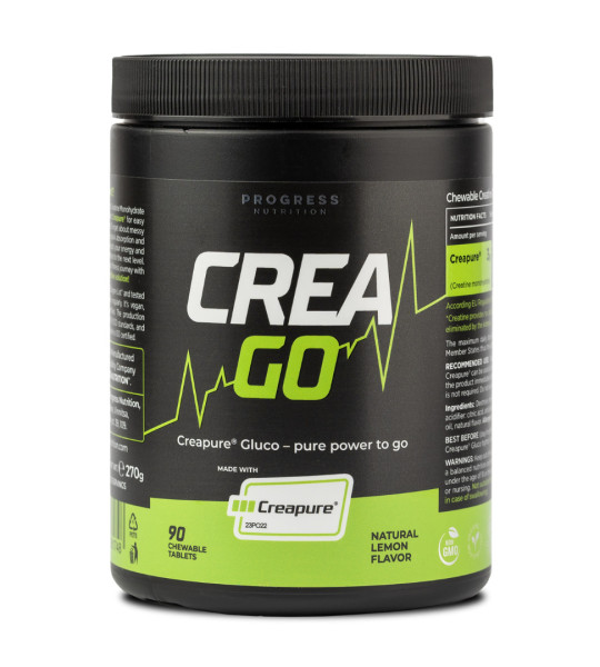 Progress Nutrition CreaGo Creapure – жувальні таблетки з преміальним запатентованим креатином Creapure®. Така таблетована форма гарантує точне дозування активних речовин та робить прийом добавки більш зручним і приємним.