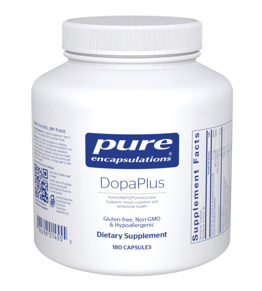 Pure Encapsulations Dopa Plus – харчова добавка в рослинних капсулах. Містить потужний комплекс тирозину, вітамінів, мінералів та рослинних екстрактів. Частина лінійки продуктів PureSYNAPSE. Оптимальний вибір для людей, які піддаються психоемоційним та розумовим навантаженням.