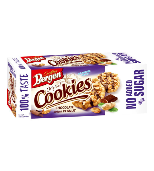 Bergen Cookies Chocolate Striped Sugar Free – смачне пісочне печиво з шоколадними смужками та арахісом. Виготовлене без додавання цукру. Має ідеально хрустку текстуру. Здорова альтернатива традиційним солодощам.