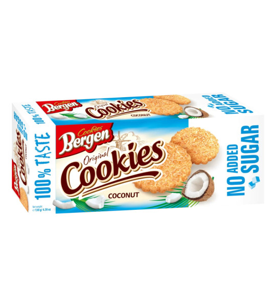 Bergen Cookies Coconut Sugar Free – смачне пісочне печиво з кокосовою ноткою. Має ніжну розсипчасту текстуру. Виготовлене без додавання цукру. Ідеальний вибір для людей, які обмежують його споживання, але не хочуть зовсім відмовлятись від солодощів.