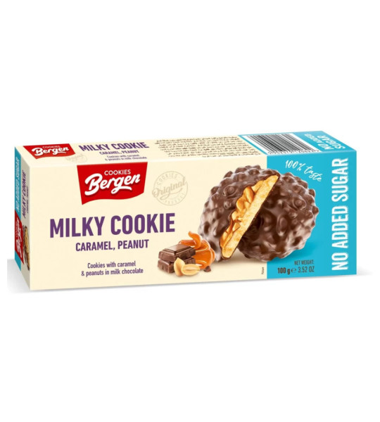 Bergen Cookies Caramel & Peanut Sugar Free – смачне печиво з карамеллю та кусочками арахісу, покрите молочним шоколадом. Має приємну хрустку текстуру. Виготовлене без додавання цукру. Ідеальний десерт чи перекус до кави або чаю для тих, хто віддає перевагу продуктам без цукру.