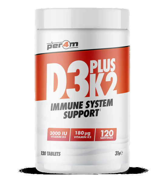 Per4m D3 Plus K2 – вітамінна добавка в таблетках. Містить ідеальний тандем вітамінів D3 та K2, які працюють синергетично. Чудово доповнить раціон фізично активних людей і не тільки.