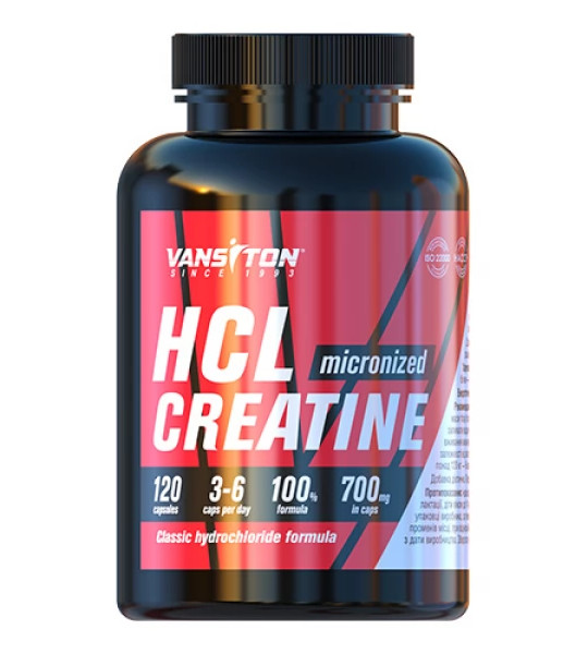 Vansiton Creatine HCL Micronized – спортивна добавка в капсулах. Містить високоефективний мікронізований креатин гідрохлорид. Не затримує воду, не спричиняє проблем з нирками та набряків в тілі. Популярний продукт серед спортсменів та бодібілдерів.